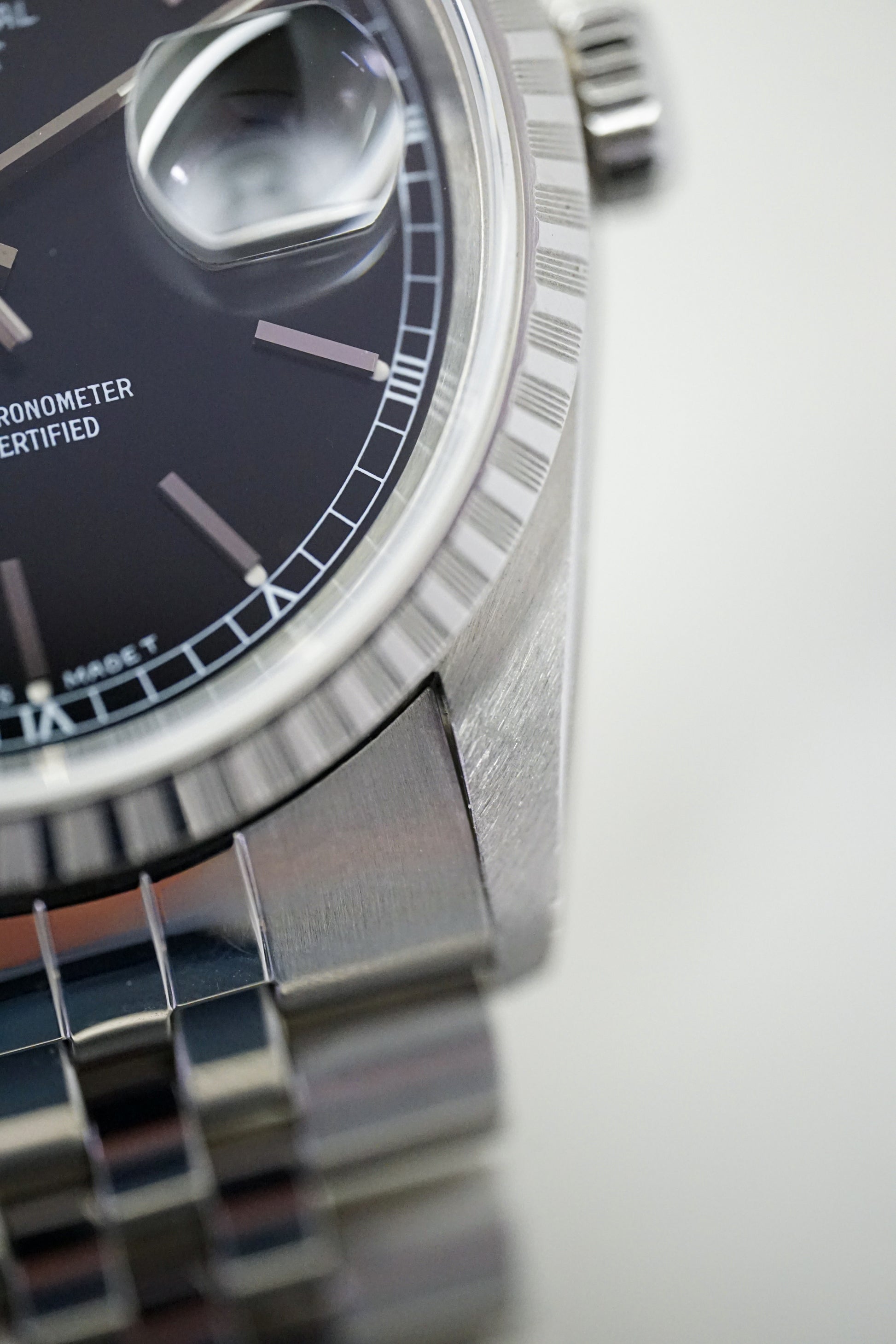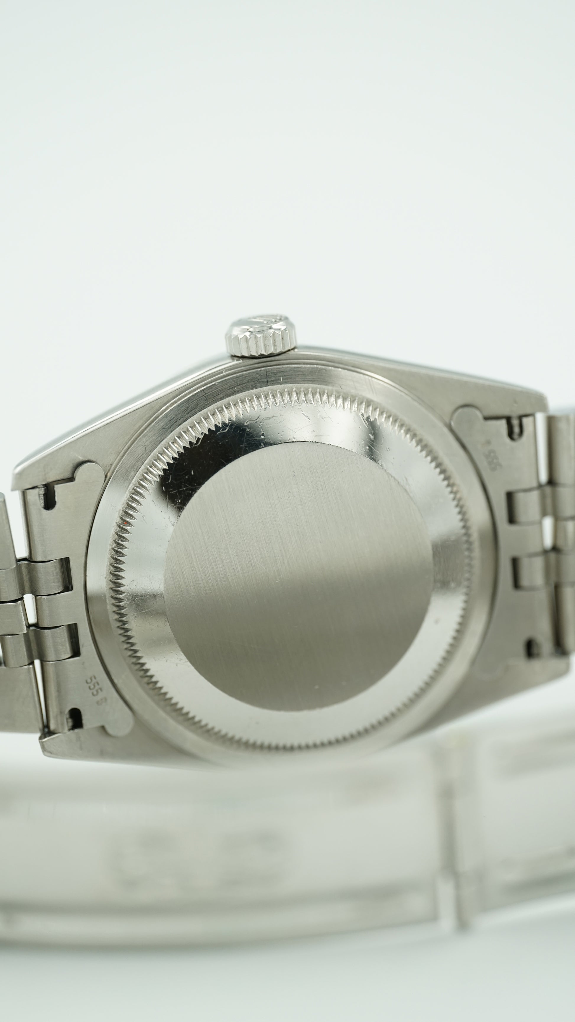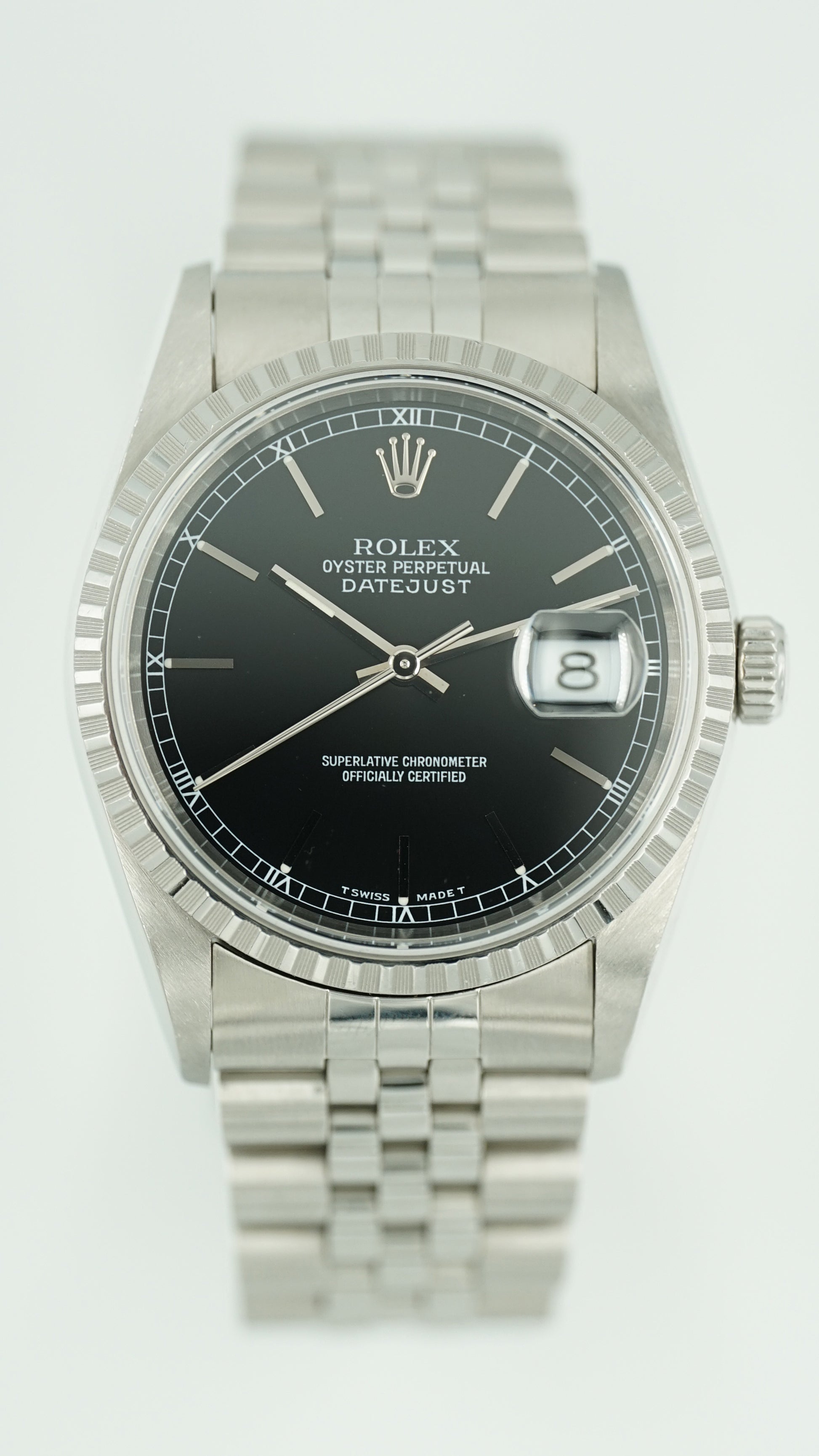 The Rolex 16220 is a classic watch model from the brand's Datejust collection, first introduced in the 1980s. It features a 36mm stainless steel case and bracelet, and a distinctive engine-turned bezel that gives it a luxurious look and feel.